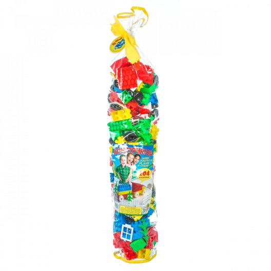 Констуктор с дребни елементи в ярки цветове – синьо, зелено, червено, бяло и жълто.