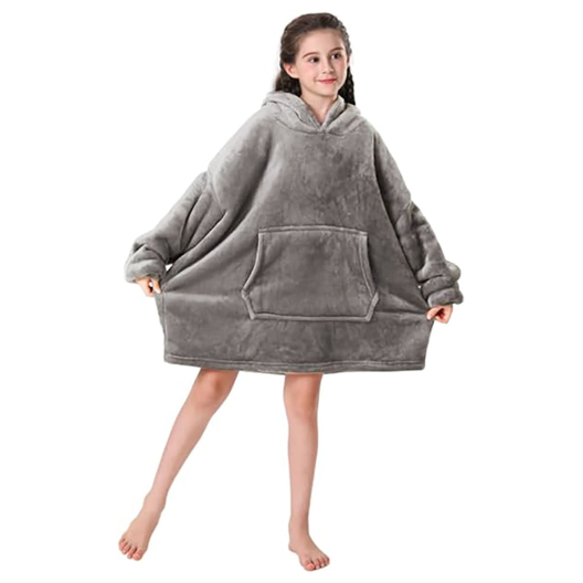 Супер меко, топло и забавно! Това детско одеяло-суичър комбинира уюта на одеяло с удобството на суичър с ръкави и качулка. Изработено от пухкава материя, то е идеално за игра у дома, гледане на филм или почивка в студените дни. Универсалният сив цвят го прави подходящо както за момичета, така и за момчета.