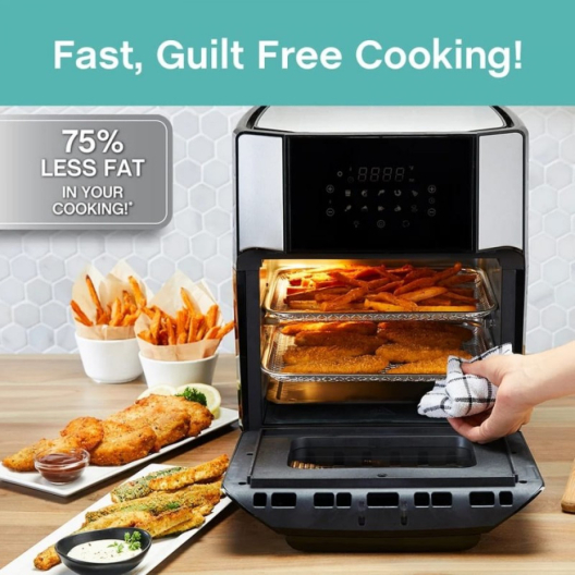 Вече можеш да готвиш вкусно, здравословно и бързо за до 15 човека едновременно! С нашият страхотен еър фраер - фурна с 12 литров капацитет и цели 3000 вата мощност, 10 функции в 1 уред - пържене, печене, дехидратиране, грил и много други! Този невероятен продукт е с 3 години гаранция и сертификат за качество от Англия!