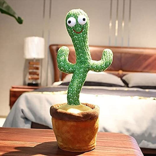 Забавна играчка - кактус, изработена от плетен плюш, мек и гладък на допир. Има големи очи и широко усмихнато лице. Има вграден микрофон, чрез който по забавен начин повтаря всички думи или звуци които чуе, а има и вградени множество песни на английски. Прекрасният пеещ и танцуващ кактус е специално проектиран за донесе на децата щастливо изживяване. Най-добрият подарък за всяко едно дете за Рожден ден, Коледа, Нова година, партита и други, а и без повод, разбира се. Когато пее е танцува, със сигурност ще привлече вниманието на вашето малко дете. Този танцуващ плюшен кактус ще се люлее и ще пее страхотни песнички, създавайки оживена и топла атмосфера във вашия дом, носейки на вашето дете незабравими моменти.