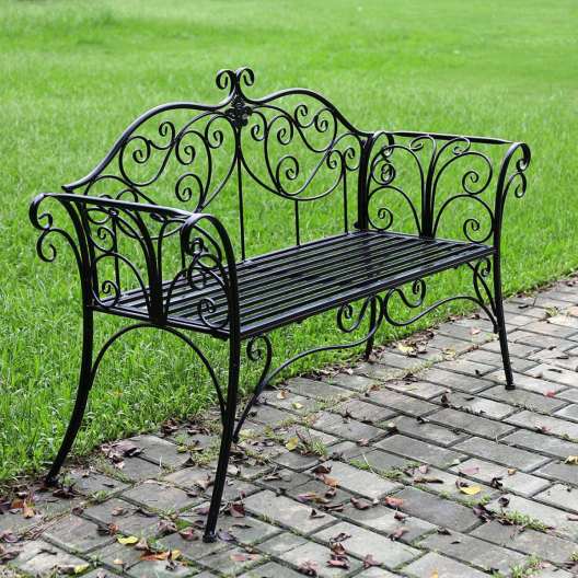Градинска метална пейка ковано желязо, романтичен дизайн, черна