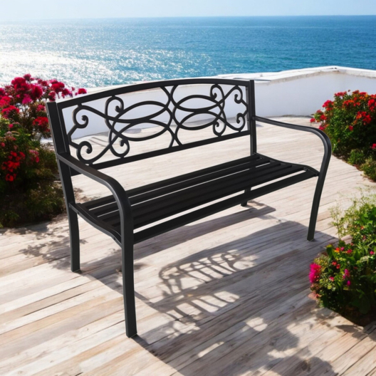 изискана градинска пейка от метал с гръб от ковано желязо. Съчетаваща