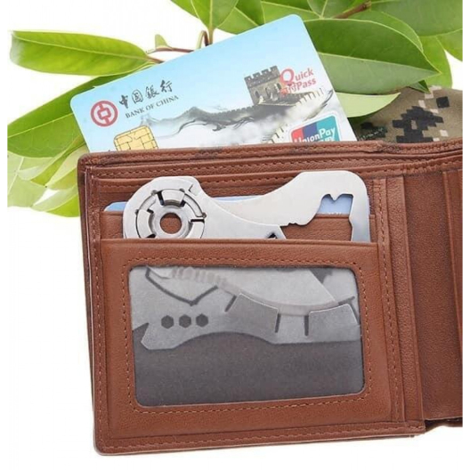 Открийте всичко, което можете да направите с металната карта 9в1. Благодарение на малкия си размер, тя се побира във всеки портфейл или картодържач. Това е важен инструмент, който можете да вземете по време на пътуване или къмпинг.