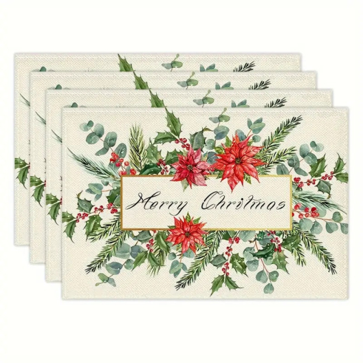 Съчетайте практичност и елегантност с комплекта от 4 броя коледни подложки за маса в дизайн „Флорални мотиви“! Тези подложки са създадени, за да донесат свежест и красота на вашата маса, като в същото време я предпазват от ежедневни следи и петна. Подходящи както за празнични събирания, така и за ежедневна употреба, тези подложки ще направят всеки повод специален.
