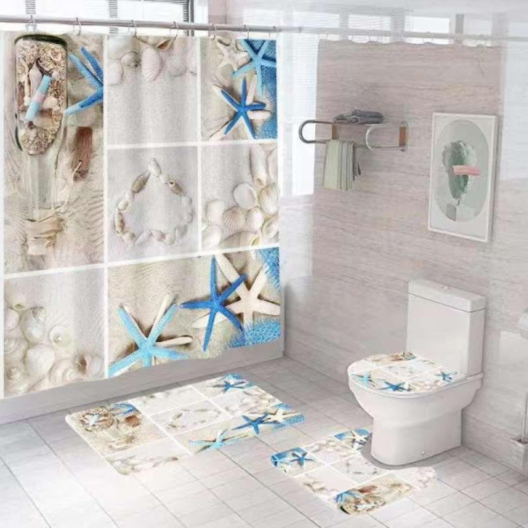 Комплект за баня: перде, 2 бр. стелки и покривало за тоалетна