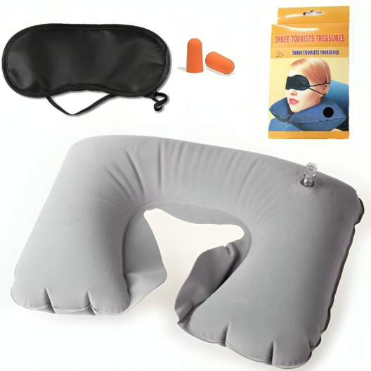 Най-добрият спътник за вашите пътувания - комплект от надуваема възглавница, превръзка за очи и тапи за уши