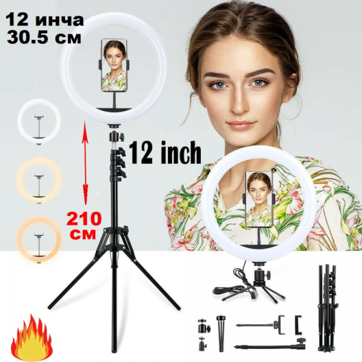 Лампа 12 инча, 210 см стойка, 3 цвята и регулиране на светимостта, стойка за 1 телефон