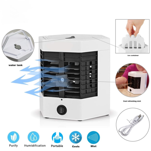 - Мощният и компактен охладител изтегля топъл въздух от помещението през своя изпарителен воден филтър и го преобразува в хладен и чист