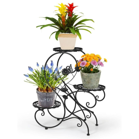 Поставка за растения ковано желязо, 3 нива, дизайн листа и пеперуди, черно