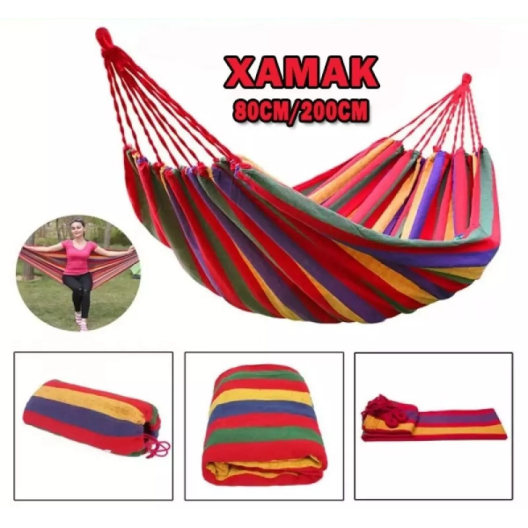 Представяме Ви текстилен двоен хамак с разнообразни цветове подходящ за градина, къмпинг и всякакъв вид отдих. Ако на близо пък няма възможност да го прикрепите може просто да го постелете като одeяло и да се насладите на пикника.
