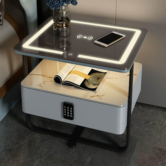 Смарт нощно шкафче с безжично зареждане, LED и заключване с парола
