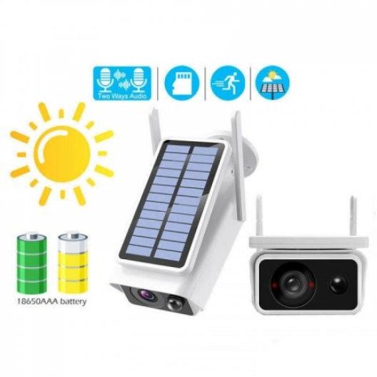 Соларна безжична Wi-FI PRO камера с автномно захранване. Full HD резолюция, вграден говорител и слот за SD карта с памет до 128GB. Камерата разполага с PIR сензор за детекция на движение и дава възможност за нощно видеонаблюдение до 20 метра. Отдалечено наблюдение в реално време и преглед на записите през мобилно устройство с приложенията и ICSee или. Поддържа две акумулаторни батерии тип 18650. Заряд на батериите чрез соларния панел. Соларният панел е подвижен и дава възможност за регулиране на ъгъла на приемане на сълчевата светлина. Подходяща за външен монтаж.