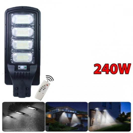 Соларна улична LED 240W лампа със сензор движение е влагозащитена и подходяща за външен монтаж като осветление за пътищата, паркове, градини, вили, външен паркинг, както и навсякъде, където липсва електрозахранване или има нужда от автономно осветление.Благодарение на вградената литиево-йонна батерия при пълна липса на слънчева радиация лампата може да свети до 24 часа в пестящ режим. Изключително лесна за монтаж, може да се постави както на различни видове стълбове, така и на стена. През деня високоефективният слънчев панел събира енергия от слънцето и я съхранява в литиева батерия. През нощта мощният светодиод автоматично ще се включи, за да осигури светлина.