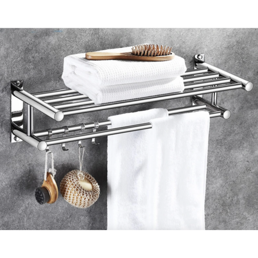 Рафтът също така е оборудван с четири куки, които допълнително увеличават неговата функционалност. Така можете да закачите кърпи, четки или други аксесоари, които искате да ви бъдат лесно достъпни.