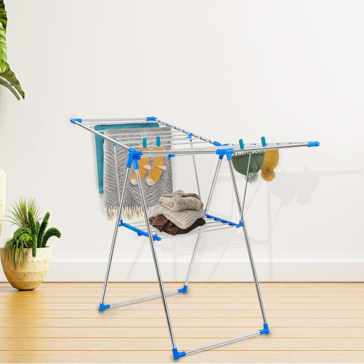 Едно от ключовите предимства на този сушилник е неговата издръжливост. Солидните стоманени пръти с диаметър от 1 см не се огъват под тежестта на мокрите дрехи, осигурявайки ви сигурност, че са на сигурно място и няма да се деформират. Сушилникът разполага с 2 независими регулируеми крила, всяко с по 7 здрави пръта, и един рафт в средата със 6 пръта. Те са емайлирани и гладки, така че дрехите да се разпределят равномерно, без риск от допълнителни набъбвания или заплитания.