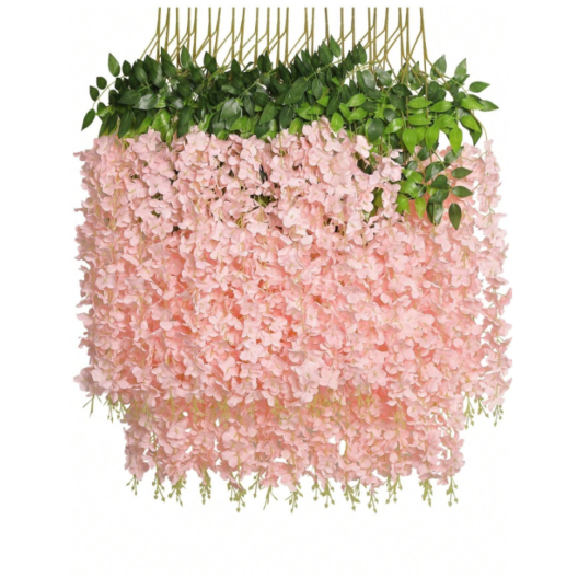 Тези красиво висящи цветове са подходяща за различни декорации – от сватбени церемонии и романтични вечери до освежаване на интериора у дома, на балкона, в градината или в търговски пространства. Лесно може да се прикрепи към стени, тавани, арки, огради или мебели, като същевременно се комбинира с други декоративни елементи за по-внушителен ефект. Гъвкавата ѝ структура позволява лесно оформяне според вашите предпочитания, без нужда от специална поддръжка.